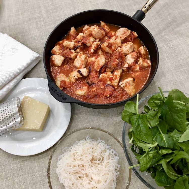 Hemmagjord tomatsås, med kyckling, lågkolhydrat pasta och italiensk musik tog oss halvvägs till Italien.