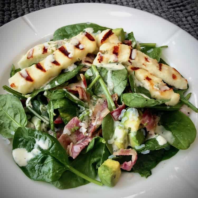 Blanda ner i spenaten ris och avokado. Klipp ner baconet i salladen och servera med Halloumiosten och den underbara såsen.