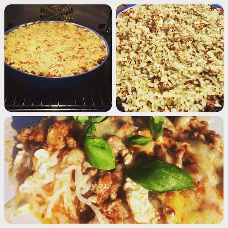 Till slut toppar du allt med riven cheddarost och gräddar sedan i ugnen i 30 min.